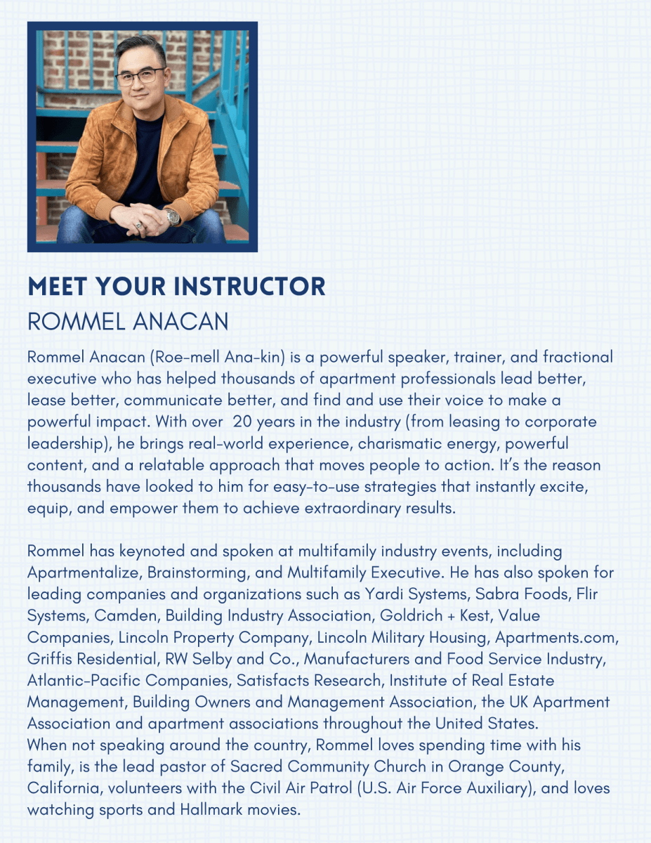 The marketplace is filled with endless options, and the real challenge isn't trying to convince someone to lease...it's removing what's in the way of a yes. This eye-opening virtual session will help leasing professionals identify the subtle habits and outdated practices that unintentionally push customers away, while showing them how to create a smoother and more effective leasing experience.